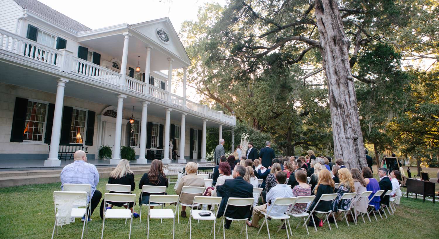 Exterior view of the property set up for a wedding with multiple people sitting in white chairs on the front lawn