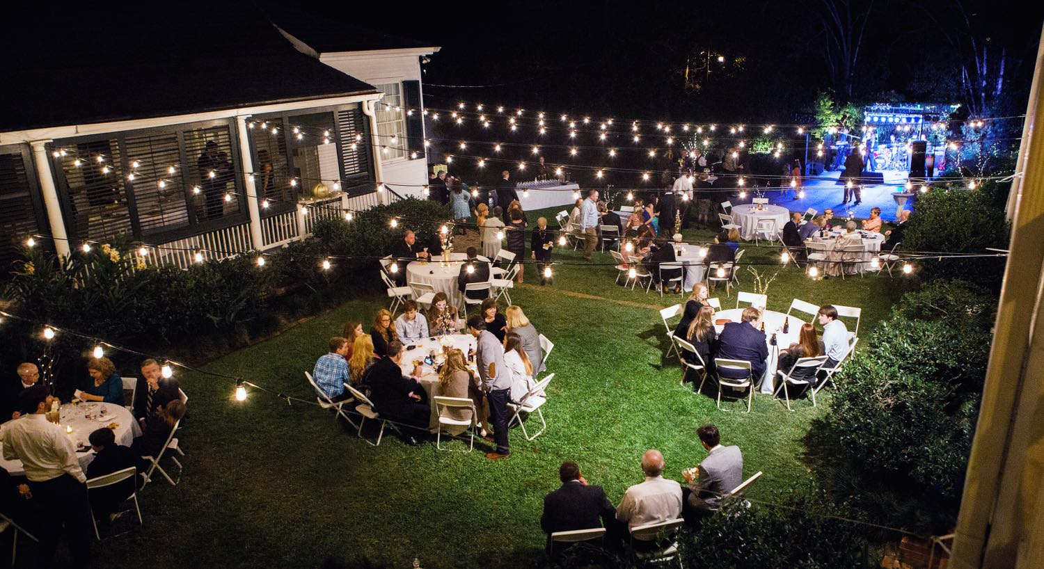 Large event set up on the lawn with a band, dance floor, and multiple tables and chairs at night